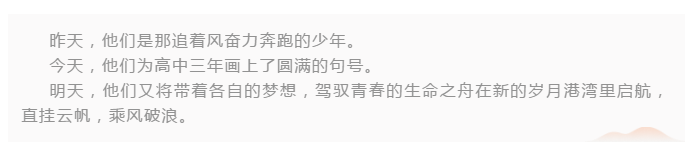 高三语文顾灵山老师作为教师代表,这是她第三次见证这样美好又带一点伤感的时刻,回想在过去与同学们相伴的日子里,一起刷过最丰厚的模拟卷,吃遍港城最优秀的食堂,见过大家每天带不同口罩的模样……离别之际的回忆总是细微又动人,今天过后,同学们奔走四方,顾老师送给临别的同学们一段话共勉,“你能飞翔,就尽情飞翔;你若有光,就尽情发光;你若能爱,请学会给予,愿我们的世界更加宽敞与明亮”!