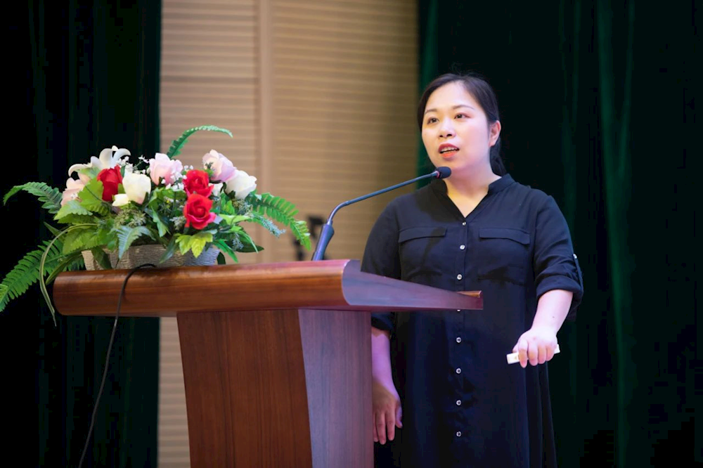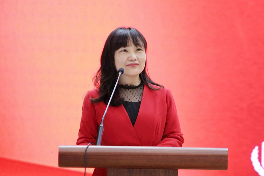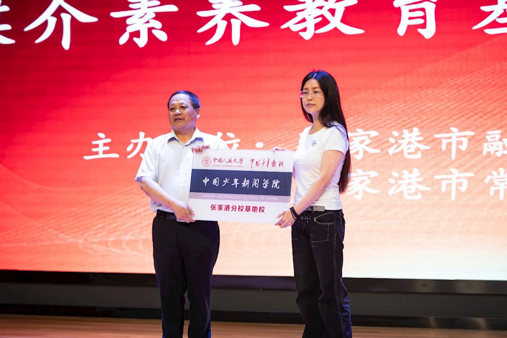 张家港市融媒体中心(传媒集团)党委副书记、总经理郭晓红女士为常青藤实验学校授予中国少年新闻学院张家港分校基地校,校长葛亚宝接牌。