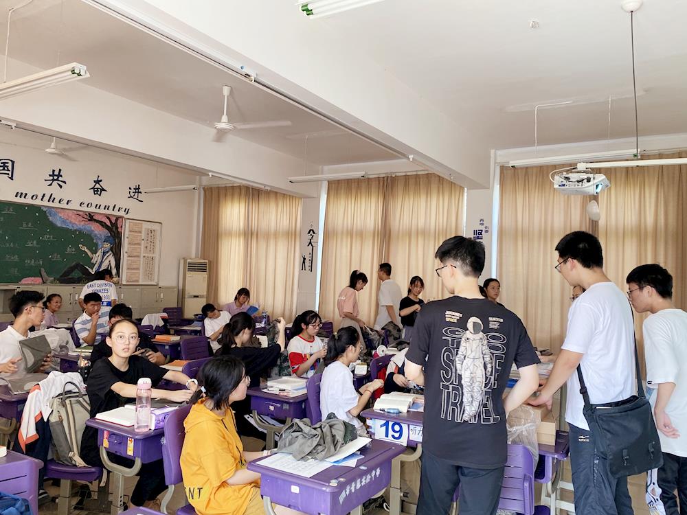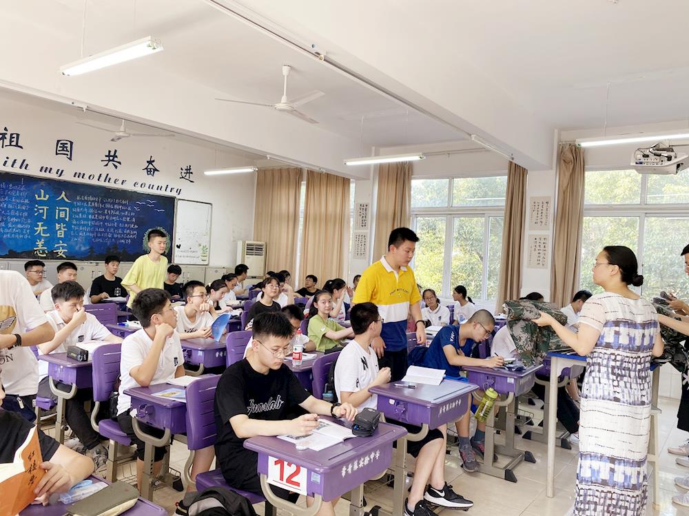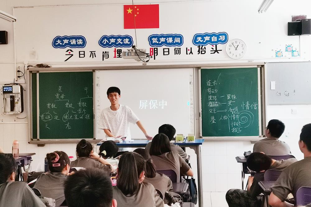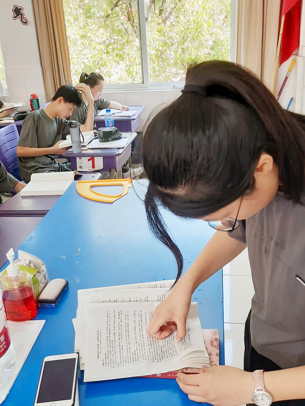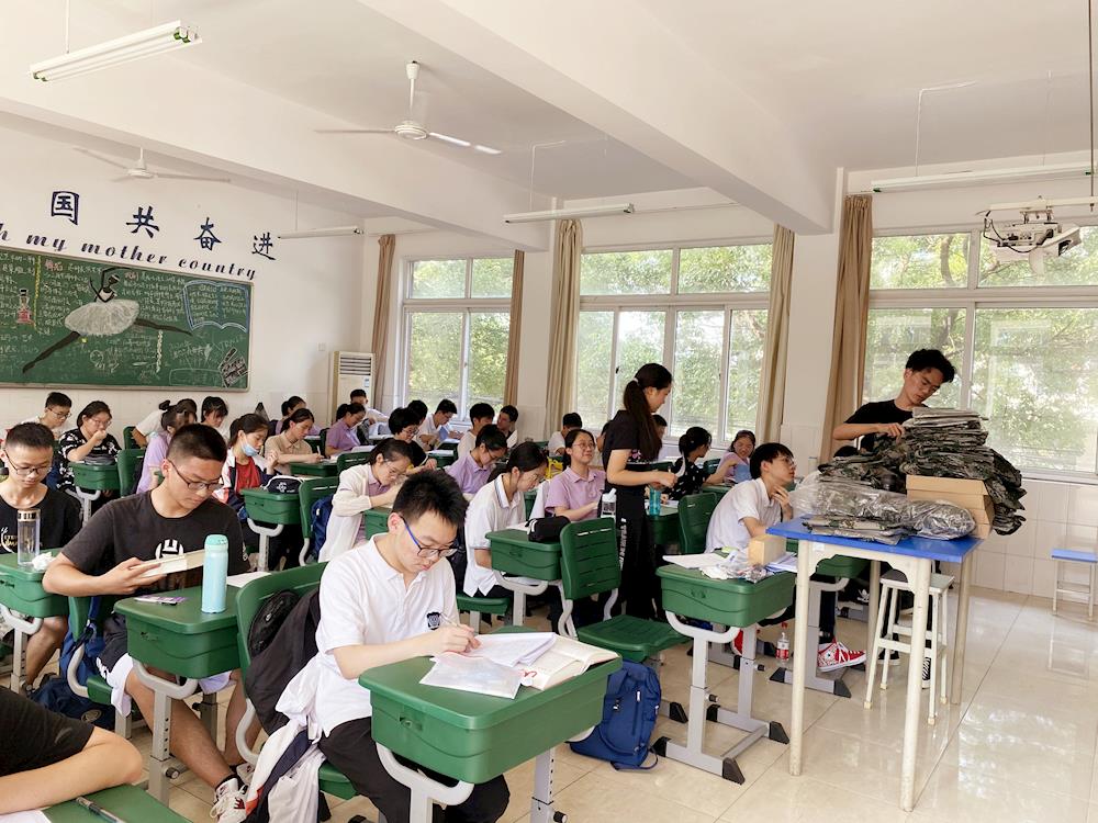 “今天是第二天带娃(  ̄▽ ̄)。八月的阳光耀眼得怕人,和几位同学一起核查校服,汗还是止不住的流。高一同学们晨训毕,走过我们身边都是迎面的热气。满员的教室并不比窗外凉爽,阅读,默写,观看《本草中国》,留着汗一丝不苟。仿佛看见三年前的自己,一个个招展,一个个沸沸腾腾的。”