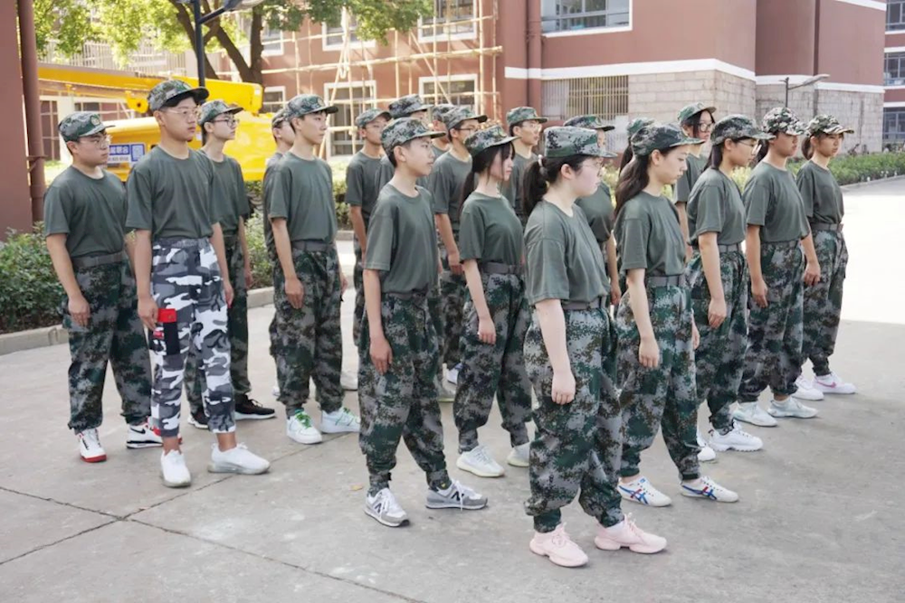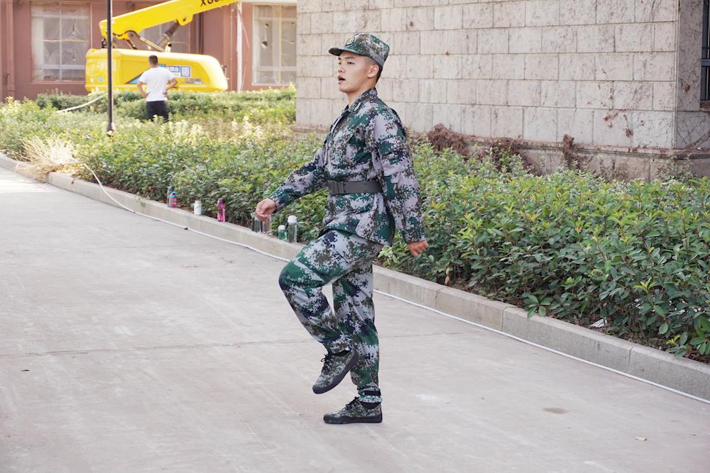 扎实的基本功从最简单的动作练起,紧张严肃的训练从站军姿和踏步开始。不管酷暑的高温,高一新生们刻苦训练。教官一丝不苟地给出示范,学生们认真地跟着教练的指示完成动作,骄阳中英姿飒爽。