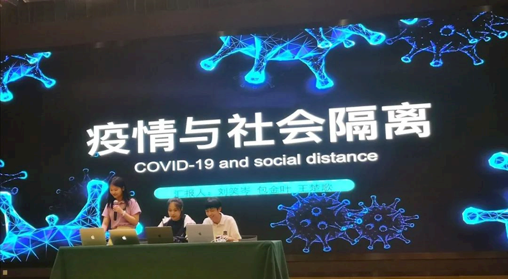 国际部高三年级的数学大咖:刘笑岑、包金叶、王楚歌三位同学,结合数学建模为军训同学带来了一场有趣又有用的疫情科普讲座,三位同学运用动画模拟、数学模型、公式编程,总结出在社交隔离不同的国家,疫情的不同发展趋势。最后强调社交隔离的重要性,并倡议每个人都应为此付出自己的一份力量。宣讲现场还设置了提问环节,并与新生们进行了深入的互动和交流,现场气氛愉悦。