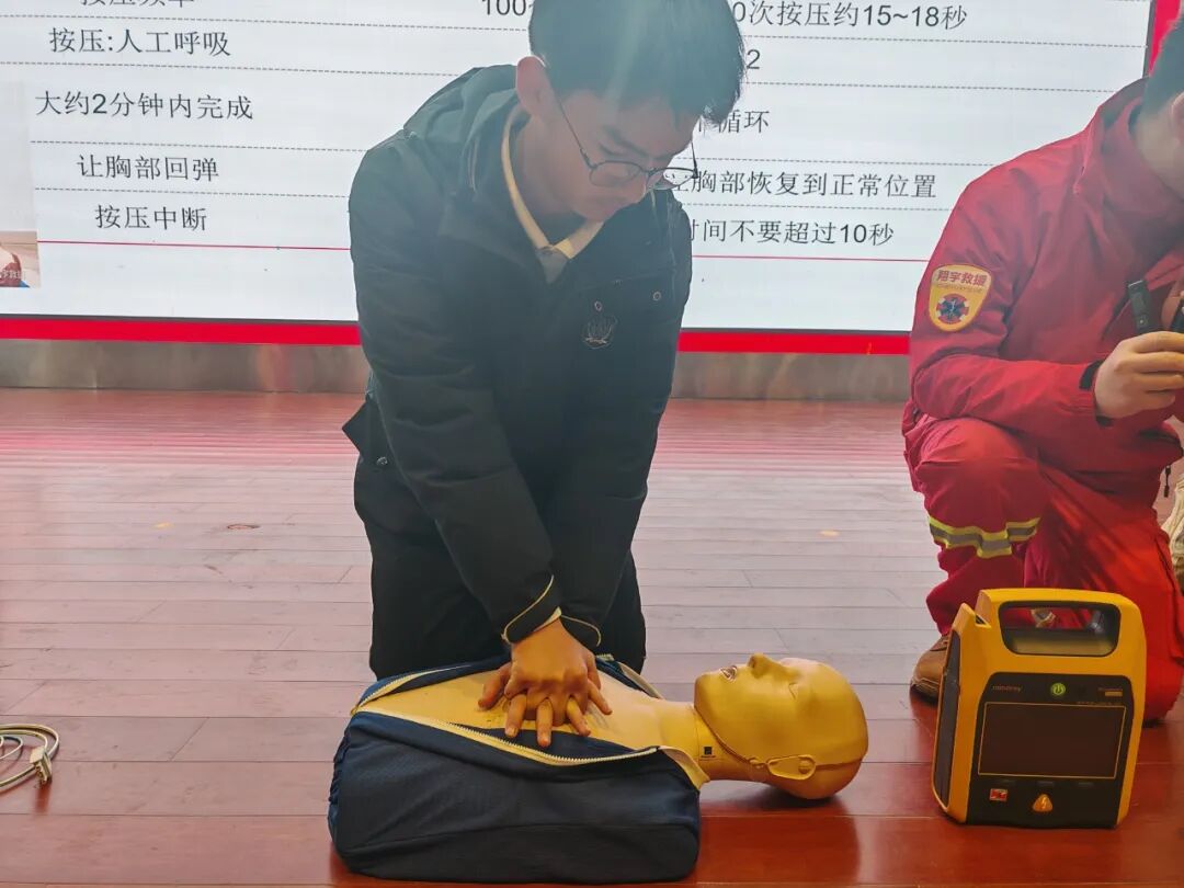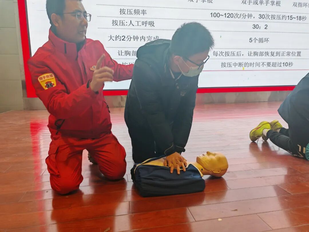 在基地的急救知识课堂上,同学们认真学习海姆立克急救法与心肺复苏技能。老师细致讲解、分步示范,大家凝神聆听,踊跃参与模拟操作。同学们在亲手实践中体会急救知识的重要性,也深刻理解了“生命至上”的含义。